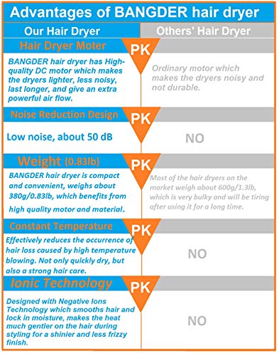 【Safety & Low Noise Technology】: BANGDER blow dryer has a removable filter which is easy to clean and the hair dryer dense mesh filter which can prevent from sucking in your hair. High temperature resistance Nylon shell and overheating protection function ensures its safety for the customers. Meanwhile, it’s hardly to hear any noise, making sure a quiet environment for each hair dryer user.